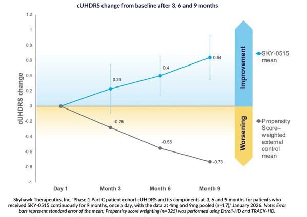 SKY-0515の第I相臨床試験のパートC患者コホートにおいて、SKY-0515を投与した患者は、3か月、6か月、9か月の時点で、ハンチントン病統一評価スケール(cUHDRS)がベースラインから平均して改善したことが示されました。Enroll-HDとTRACK-HDを用いた傾向スコア重み付けに基づく症状のある患者におけるcUHDRSの9か月時点の予想悪化は-0.73点であるのに対し、本試験の9か月時点のプール解析での改善は+0.64点となりました。